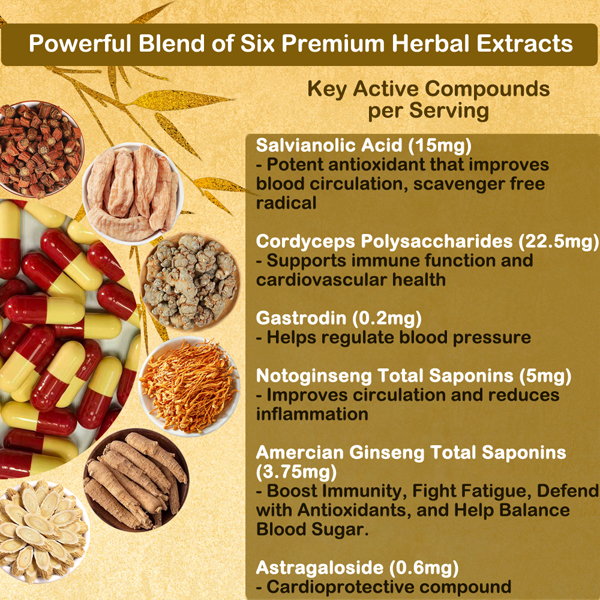 Ge Gen (Kudzu) & Huang Qi (Astragalus): Trụ cột của sức khỏe mạch máu và khả năng thích ứng. Giúp duy trì mức huyết áp khỏe mạnh và hỗ trợ khả năng phục hồi tự nhiên của cơ thể trước căng thẳng.